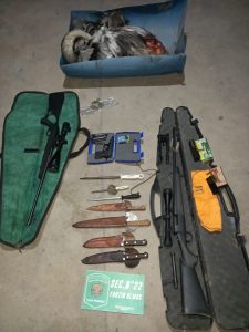vehículo se observan, producto de la caza, cortes cárnicos de animal de la especie Ñandú, Un (01) Fusil calibre 223, Una (01) Carabina semi-automática marca “Orbea”, Una (01) Pistola marca Bersa, con su respectiva documentación, como así también cuatro cuchillos y tres chairas; por tal motivo la prevención procedió a notificarlos de sus derechos y de la formación de causa por Infracción a la ley