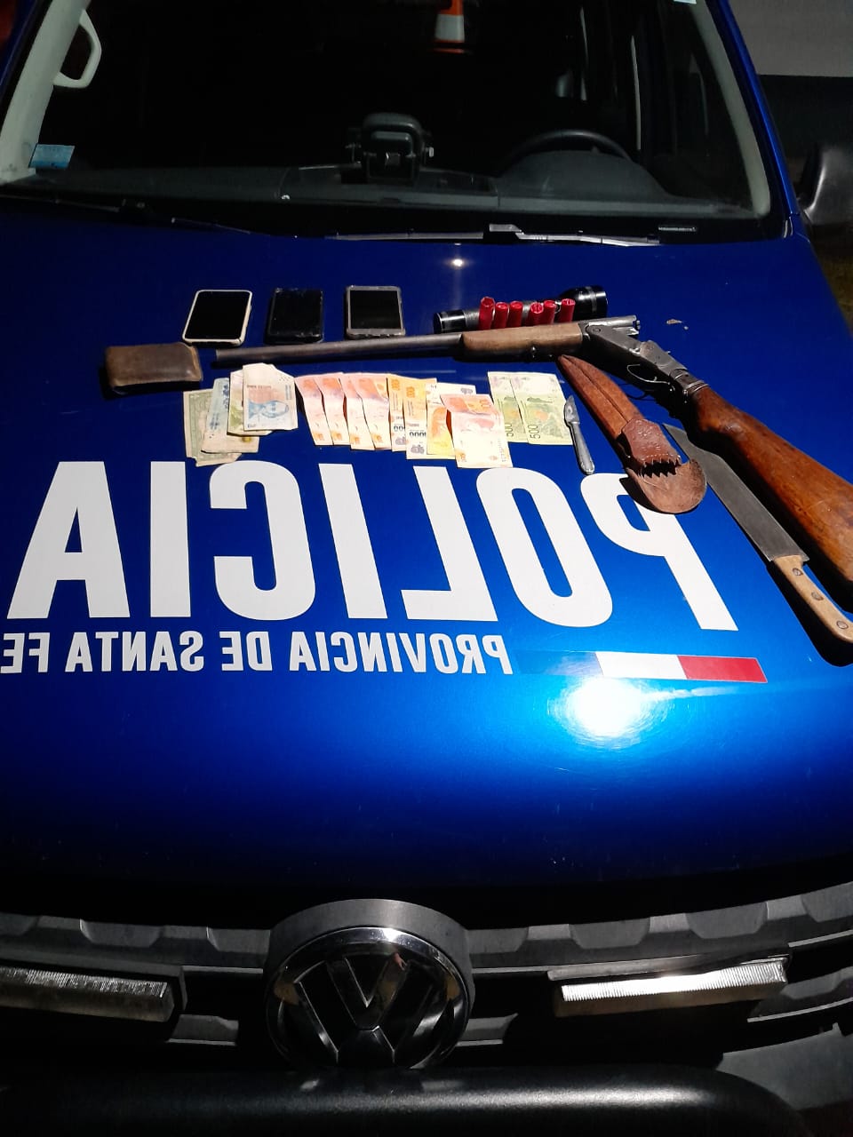 una linterna, (2)dos cuchillos, (3) tres teléfonos celulares, (1) una billetera, ($9057) nueve mil