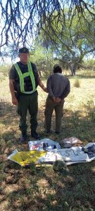 Los efectivos policiales de la Guardia Rural “Los Pumas” de la mencionada localidad, mientras desarrollaban patrullajes preventivos en sus respectivas jurisdicciones, identificaron a un sujeto mayor de edad, quien se trasladaba en su moto vehículo particular marca motomel, visualizándose una bolsa con diferentes cortes cárnicos de animal porcino de la especie cimarrón de unos 20 kg aproximadamente, el sujeto realizaba la actividad de caza furtiva; por tal motivo se les confeccionaron “Acta de Infracción a la Ley Pcial. Nº 4830 y normas complementarias” (ley de caza), por cazar sin licencia habilitante, cazar en camino público, con canes de raza galgos, con procedimientos antideportivos.