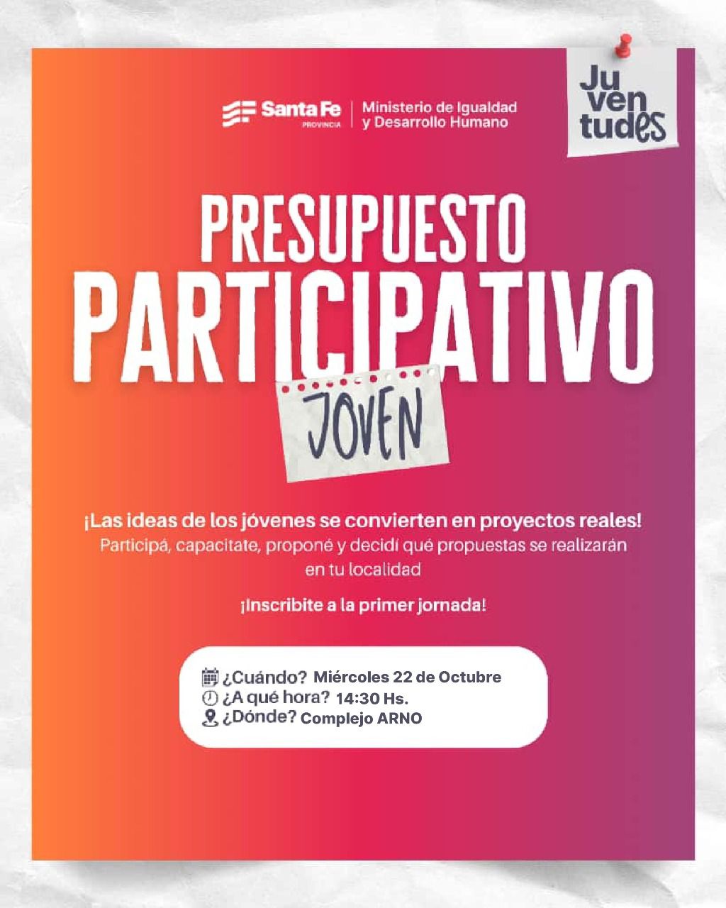 La Municipalidad de Villa Ocampo y el Gobierno de la Provincia de Santa Fe, a través de la Dirección Provincial de Juventudes del Ministerio de Igualdad y Desarrollo Humano, invitan a participar de la charla informativa sobre el Presupuesto Participativo Joven.