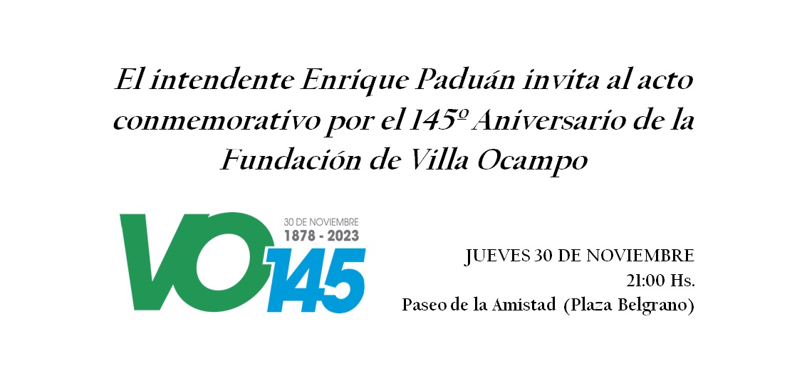 El intendente Enrique Paduán invita a participar de las actividades oficiales programadas para conmemorar el 145º Aniversario de la Ciudad, que contará con la presencia de un delegación de descendientes del fundador Manuel Ocampo Samanés, este jueves 30 de noviembre.