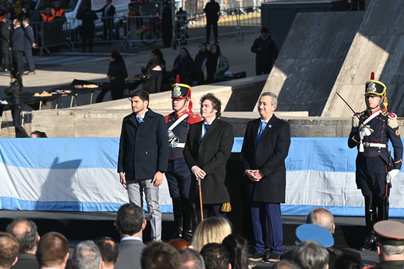 El gobernador de Santa Fe, Maximiliano Pullaro, junto al presidente de la Nación, Javier Milei, y el intendente de Rosario, Pablo Javkin, encabezó este jueves el acto central por el Día de la Bandera, al conmemorarse el 204º aniversario del paso a la inmortalidad del general Manuel Belgrano. Los mandatarios estuvieron acompañados por miembros de los gabinetes nacionales, provinciales y municipales.