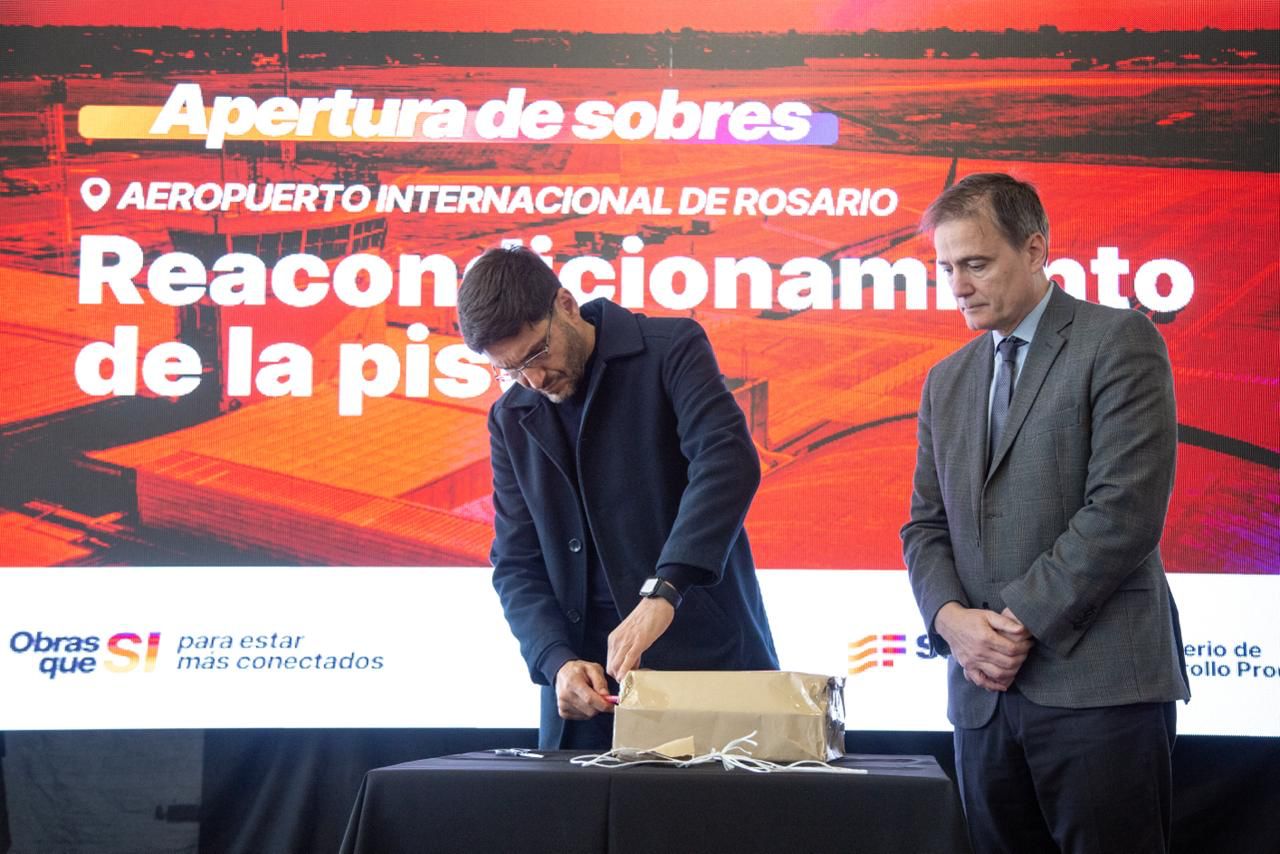 El gobernador encabezó la apertura de ofertas para la renovación integral de la pista del Aeropuerto Internacional Rosario. Se presentaron tres propuestas. Con una inversión de 34.800 millones de pesos, la Provincia financiará en su totalidad una obra estratégica que la Nación dejó sin ejecutar.