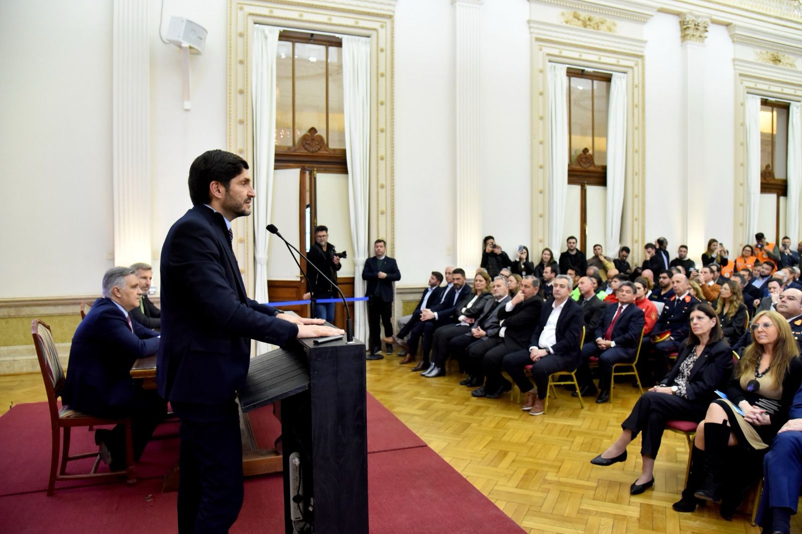 Del acto participaron además el intendente de Rosario, Pablo Javkin, y su par de Santa Fe, Juan Pablo Poletti; la presidenta de la Cámara de Diputados, Clara García; legisladores nacionales y provinciales de Santa Fe, Córdoba y Entre Ríos; ministros y secretarios de los gabinetes de Santa Fe, Córdoba y Entre Ríos; integrantes de la Mesa Ejecutiva de la Región Centro, Claudia Giaccone, Carlos Massei y Jorge Chemes; el director Nacional de Apoyo Federal a Emergencias del Ministerio de Seguridad de la Nación, Santiago Hardei; intendentes y presidentes comunales de la región; concejales de la ciudad, funcionarios y equipos técnicos de las áreas de protección civil de las tres provincias; bomberos voluntarios y bomberos zapadores.