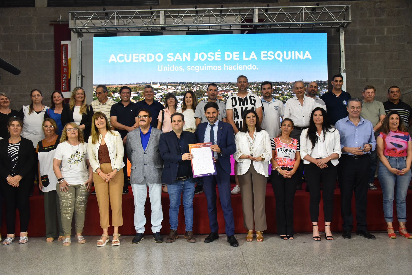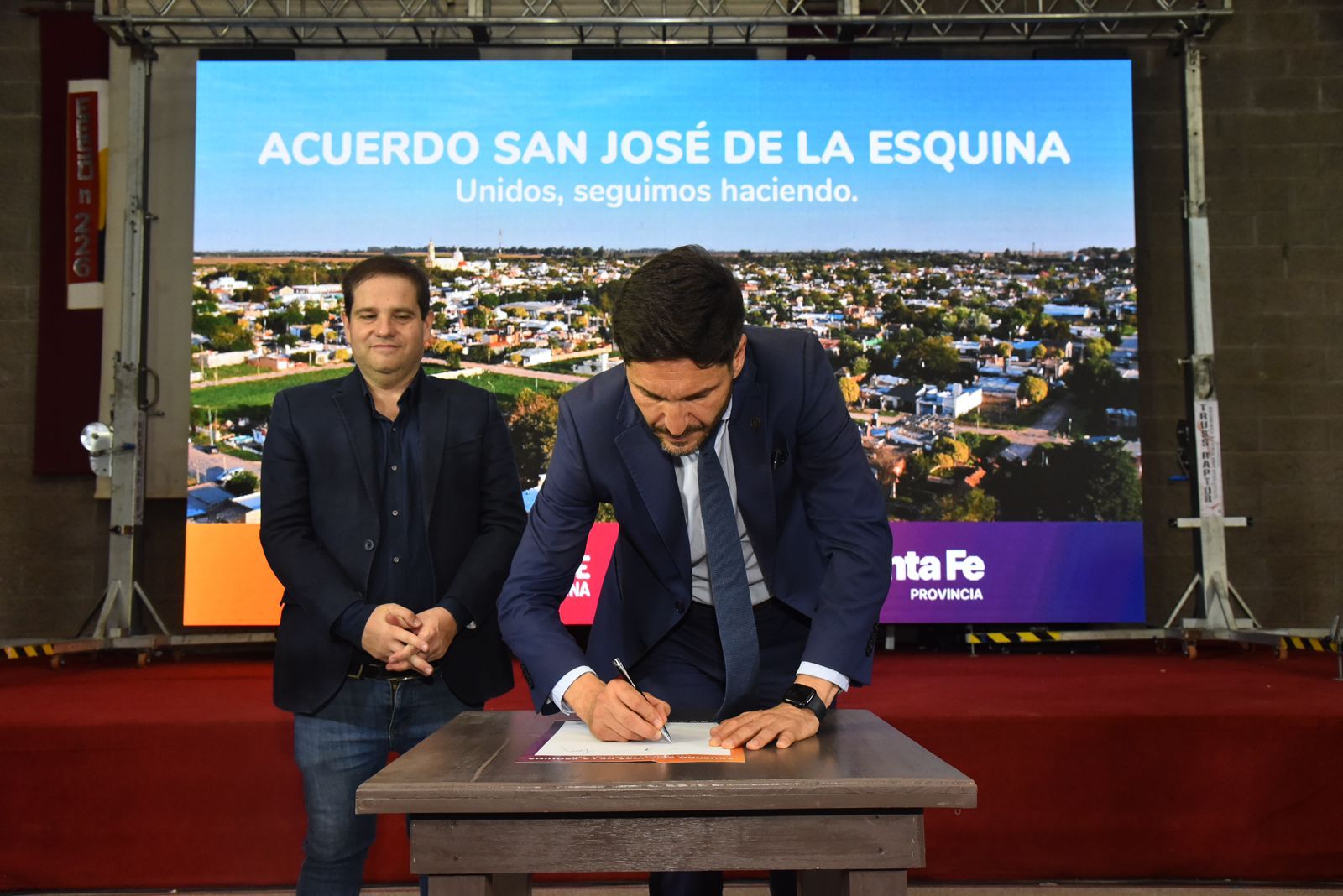 El gobernador Maximiliano Pullaro estuvo el viernes por la tarde en San José de la Esquina, donde firmó junto al presidente comunal Ezequiel Ruani un acuerdo por una serie de obras para la localidad que fue recientarada ciudad y el año próximo elegirá intendente y concejales.