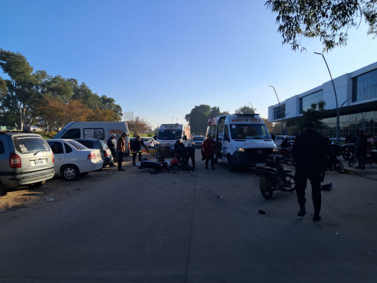 Por causas que aún se tratan de establecer, colisionaron una motocicleta marca Triax de 150 c.c., sin chapa patente visible, conducida por un joven de 23 años domiciliado en calle España, quien iba acompañado por la ciudadana Daiara Tozzi Pagano, de 21 años; y una motocicleta marca Zanella de 110 c.c., al mando de un hombre de 56 años.