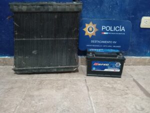De diligencias llevadas a cabo se procedió a la aprehensión de Un hombre, mayor de edad, vecino de este medio, determinándose que los elementos sustraídos se encontrarían en una vivienda del Barrio Carmen Luisa. Constituidos en calle 85 al 380, fueron atendidos por propietario arrojando resultados negativo. Luego se hicieron presentes en calle 71 al 444 donde morador manifestó haber comprado dicha batería, haciendo entrega de manera voluntaria de (01) batería MATEO 12/75, procediéndose a su secuestro. Posteriormente presentes en calle 64 al 1646 de B° Itati encargada hizo entrega voluntaria de (01) radiador pintado de color negro. Se dio conocimiento al Fiscal en Turno labrándose actuaciones caratuladas a prima facie ROBO.