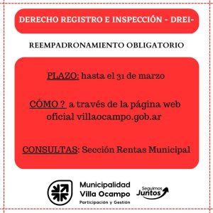 La Secretaría de Hacienda y Finanzas de la Municipalidad de Villa Ocampo recuerda a los responsables del Derecho de Registro e Inspección (DReI) que deben cumplir con el Reempadronamiento Obligatorio del mismo, establecido por Ordenanza 1648/22.