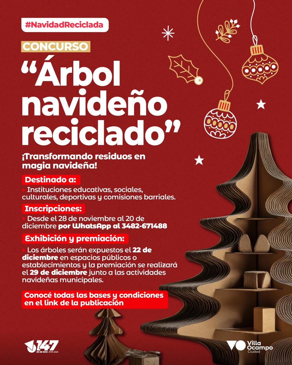 La Municipalidad de Villa Ocampo invita a todas las instituciones, clubes y comisiones barriales de la ciudad a participar del concurso “Árbol Navideño Reciclado”, una propuesta que busca promover el cuidado del ambiente y la creatividad comunitaria bajo el lema “Transformando residuos en magia navideña”.