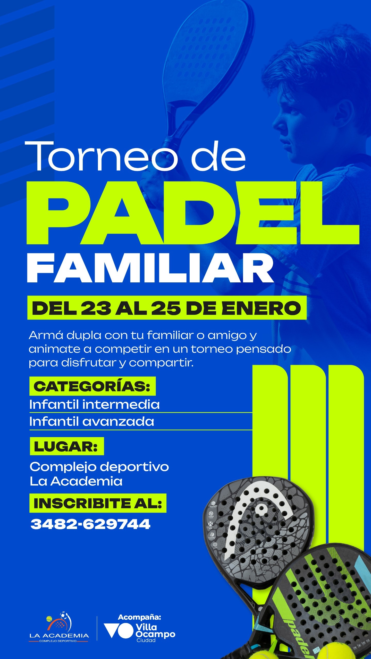Del 23 al 25 de enero se llevará a cabo en el Complejo Deportivo La Academia, en la ciudad de Villa Ocampo, un Torneo de Pádel Familiar, una propuesta pensada para disfrutar del deporte en un ambiente recreativo y de encuentro entre familiares y amigos.