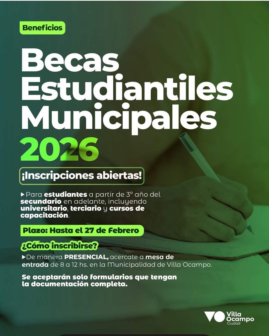 La Municipalidad de Villa Ocampo informa que se encuentra abierta la convocatoria para las Becas Estudiantiles Municipales 2026, una política pública destinada a acompañar y fortalecer la trayectoria educativa de jóvenes de la ciudad.