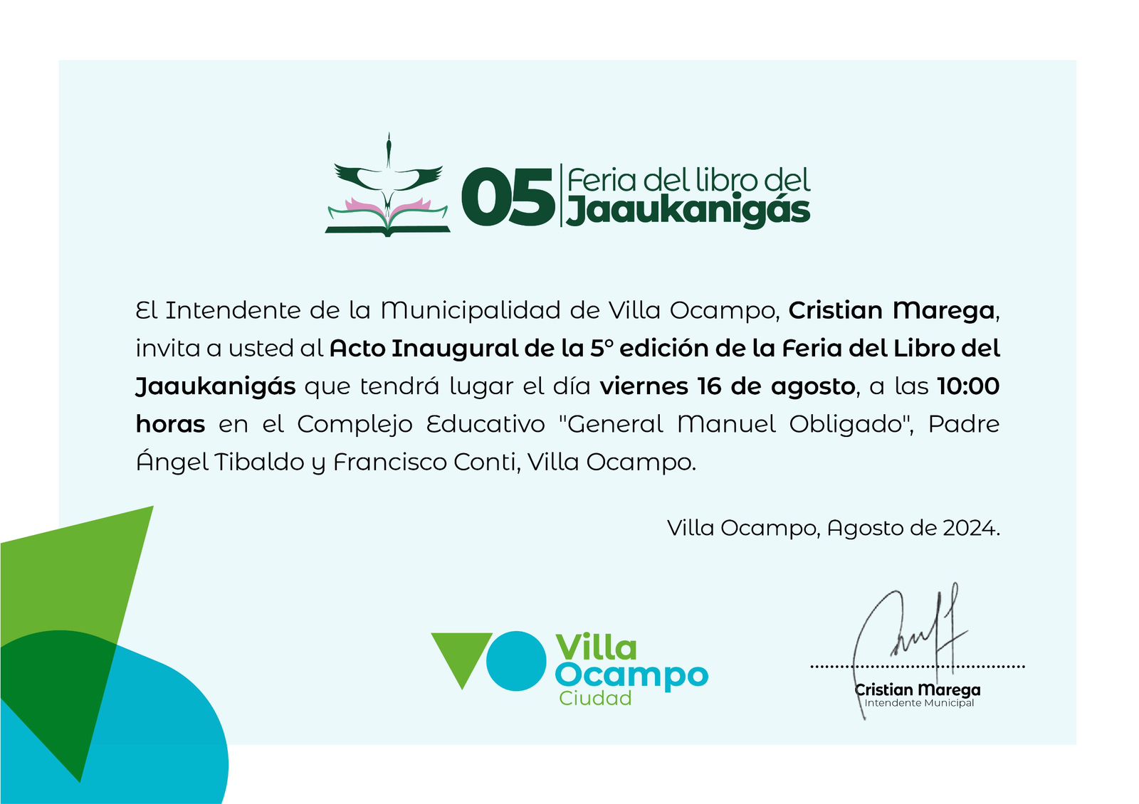 El intendente “Cristian Marega” , junto a la Secretaría de Cultura y Comunicación de la Municipalidad de Villa Ocampo, invitan a medios de comunicación y toda la comunidad a participar del Acto Inaugural de la 5° Feria del Libro del Jaaukanigás, el cual se llevará a cabo mañana viernes 16 de agosto a las 10 hs. en el Complejo Educativo “General Manuel Obligado” (P.A. Tibaldo y Fco. Conti).