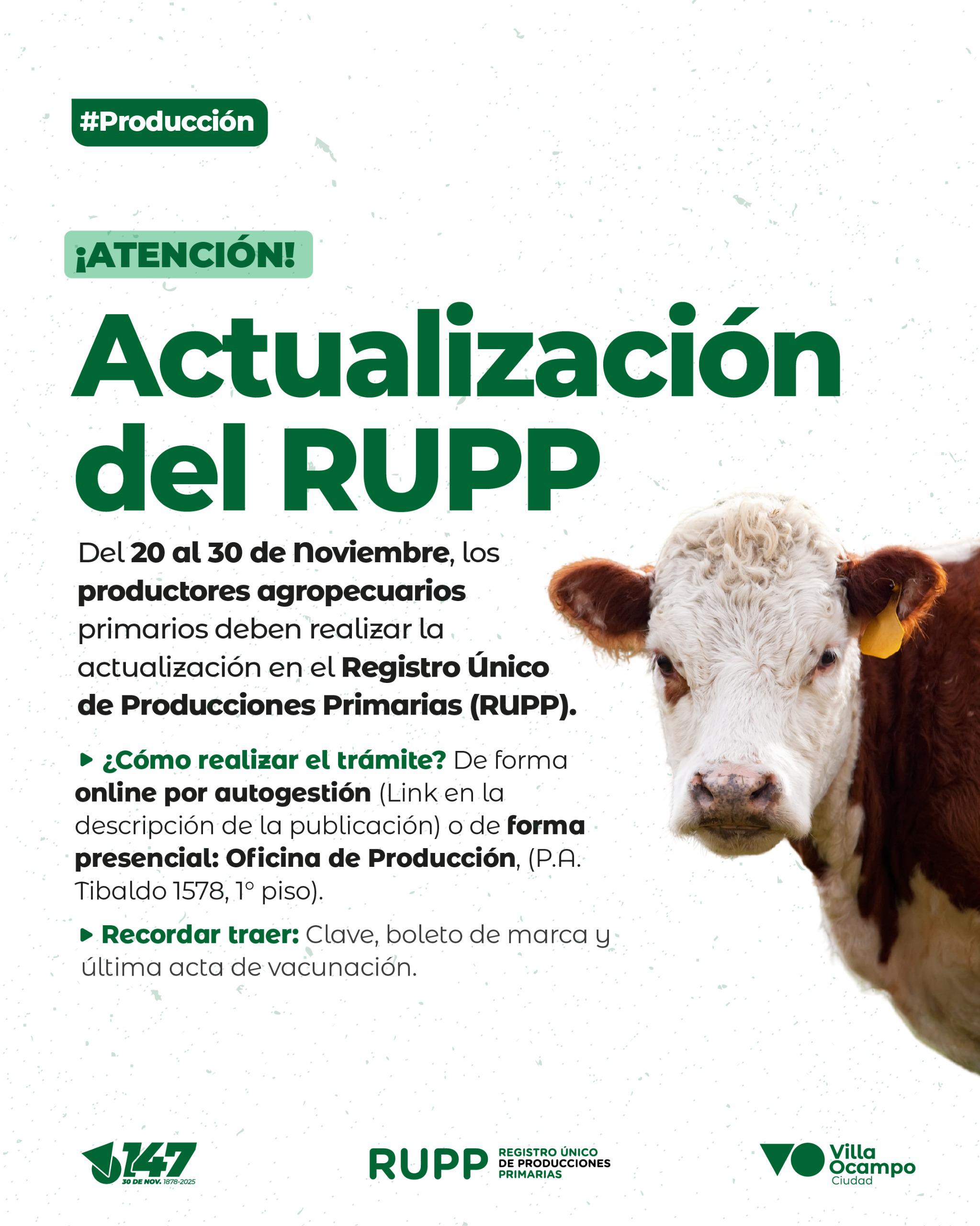 La Municipalidad de Villa Ocampo informa a todos los productores agropecuarios primarios que del 20 al 30 de noviembre se debe realizar la actualización obligatoria en el Registro Único de Producciones Primarias (RUPP).