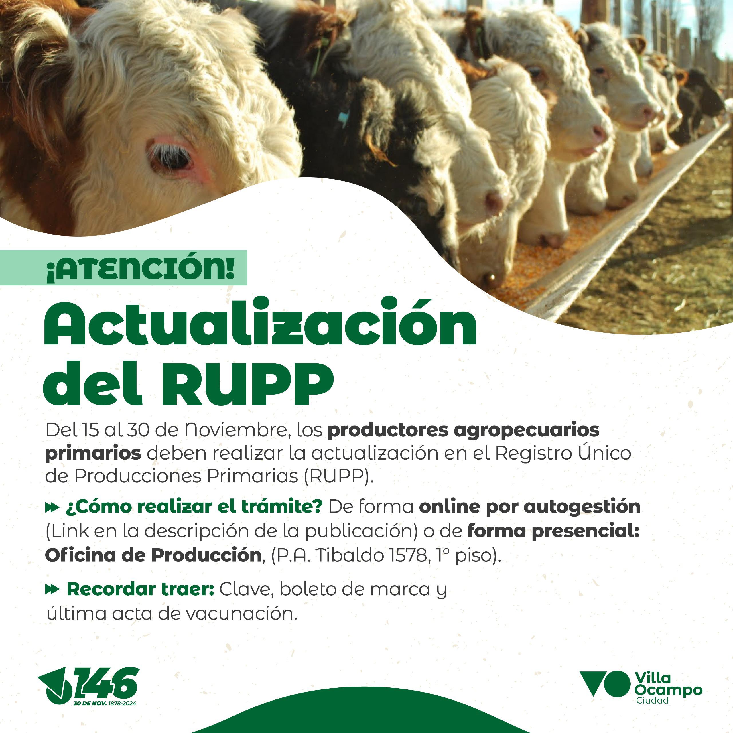 La Municipalidad de Villa Ocampo recuerda a los productores primarios del distrito Villa Ocampo, que desde el día 15 al 30 de noviembre deben realizar la actualización en el Registro Único de Producciones Primarias (RUPP).