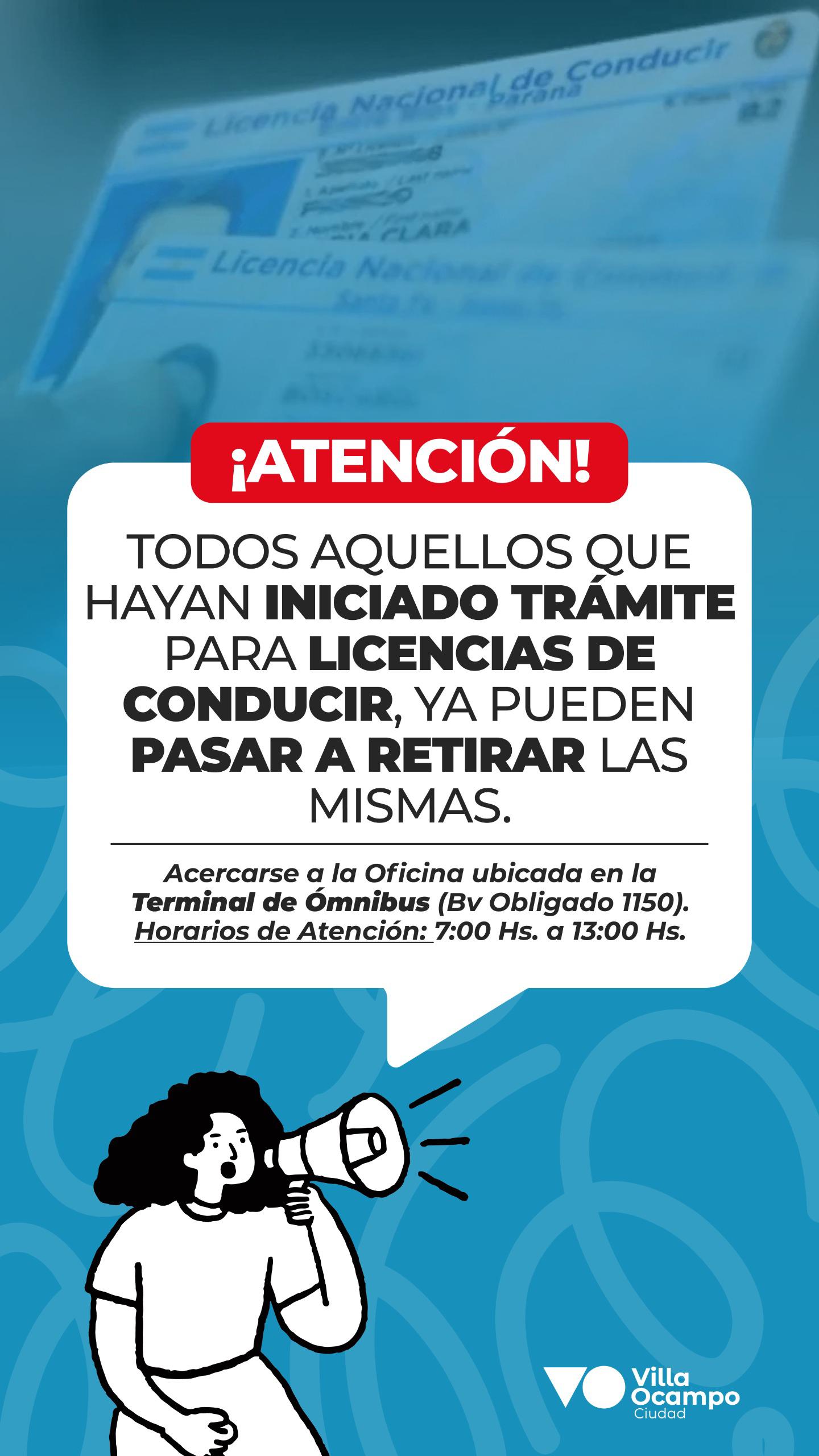 La Oficina de Licencia de Conducir de la Municipalidad de Villa Ocampo informa a la comunidad que quienes hayan iniciado el trámite de licencia de conducir, pueden pasar a retirar su licencia física por dicha oficina, de lunes a viernes de 7 a 13 hs. ubicada en la Terminal de Ómnibus de nuestra ciudad.