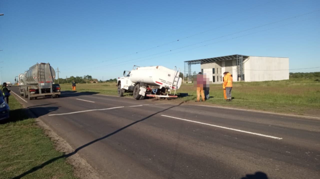 Un camión de transporte de agua de la empresa ICF sufrió un incidente en la Ruta Nacional N° 11, a la altura del Club Banco Nación, en Villa Ocampo. El vehículo perdió una rueda del eje trasero y parte del camión quedó sobre la cinta asfáltica.