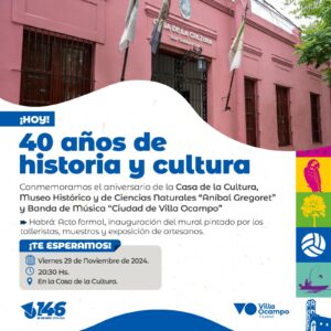 A las 20:30 horas , en la Casa de la Cultura “Raúl Scalabrini Ortiz” (Tibaldo 1240) , se conmemorará el 40° aniversario de este emblemático espacio como también el Museo Histórico y de Ciencias Naturales “Aníbal Gregoret” y la Banda de Música “Ciudad de Villa Ocampo” . El evento incluirá un acto formal, la inauguración de un mural realizado por talentosos talleristas y una exposición de artesanos, en homenaje a cuatro décadas de trabajo dedicado al arte, la historia y la cultura.