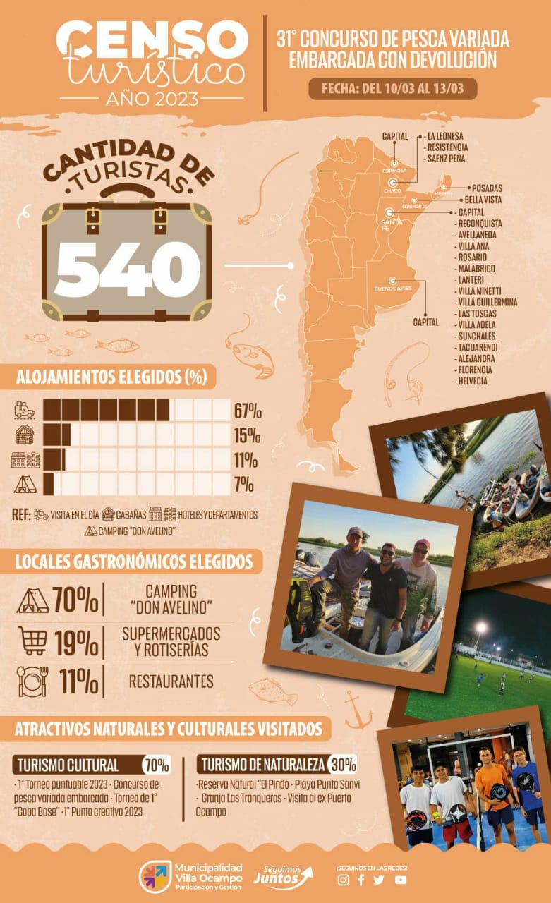 La Secretaría de Sistemas Productivos y Medio Ambiente de la Municipalidad de Villa Ocampo informa que la Dirección de Turismo llevó a cabo un nuevo censo turístico durante el fin de semana pasado, cuando nuestra ciudad fue sede del 31º Concurso de Pesca Variada Embarcada.