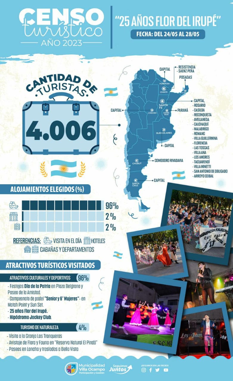 La Secretaría de Sistemas Productivos y Medio Ambiente de la Municipalidad de Villa Ocampo informa que la Dirección de Turismo llevó a cabo un nuevo censo turístico durante el pasado fin de semana extra largo, cuando nuestra ciudad fue sede de diversas actividades deportivas y culturales.