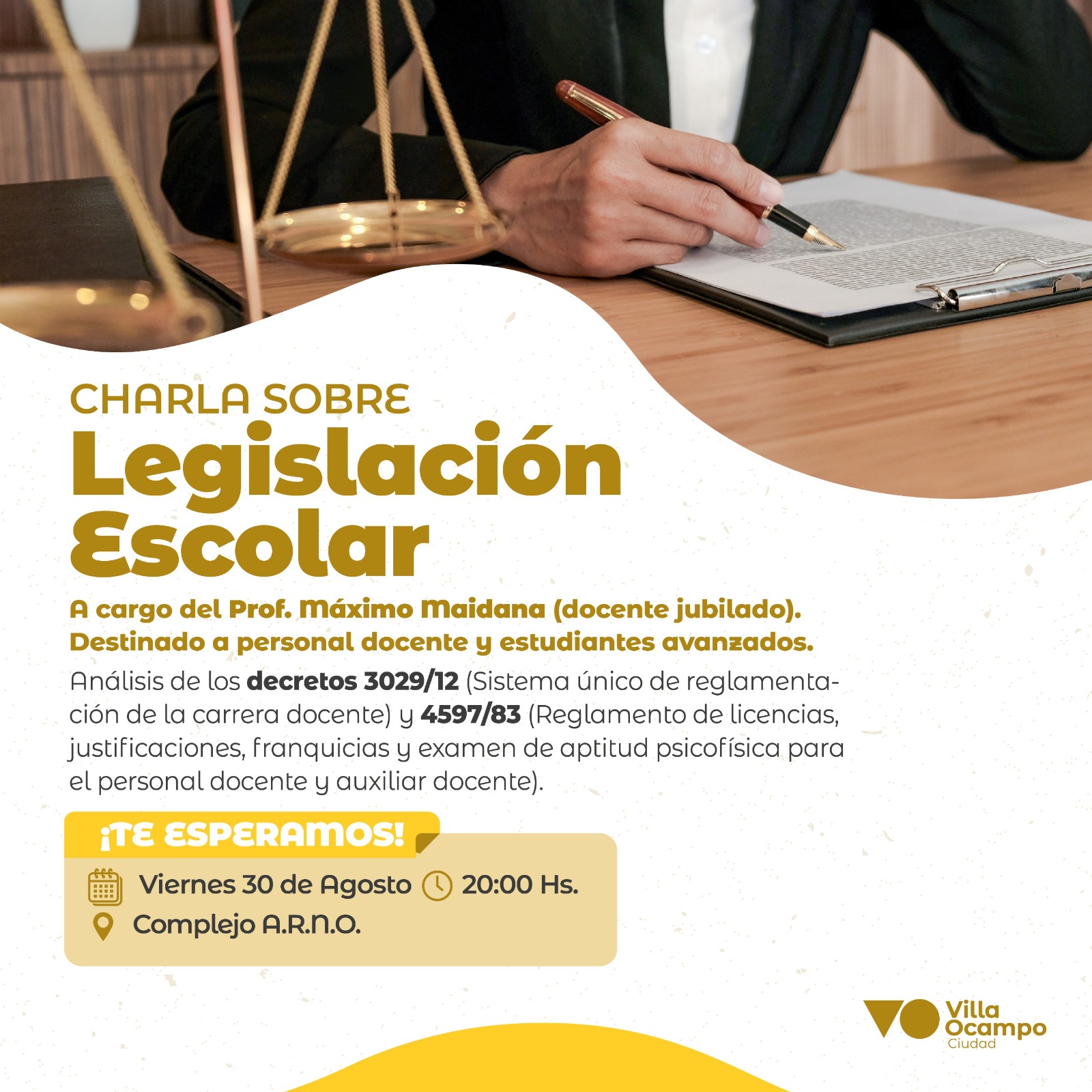El área de Educación de la Municipalidad de Villa Ocampo invita a la comunidad a una charla sobre “Legislación Escolar” a cargo del Prof. Máximo Maidana (docente jubilado).