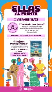18:00 hs: “Merienda con Rosas”: taller de empoderamiento femenino, autoconocimiento y amor propio, en el CAF Juan Pablo II. Organizado junto a la agrupación Rosas del Jaaukanigás.