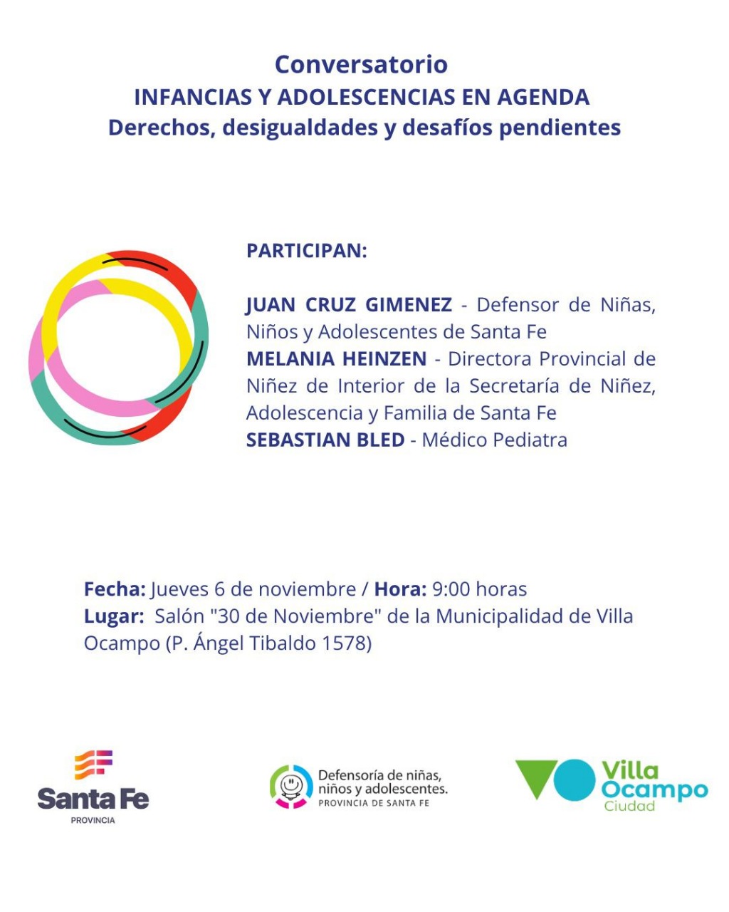 La Municipalidad de Villa Ocampo invita a participar del conversatorio “Infancias y Adolescencias en Agenda: Derechos, desigualdades y desafíos pendientes”, que se llevará a cabo el jueves 6 de noviembre a las 9:00 horas en el salón “30 de Noviembre” (P. Ángel Tibaldo 1578).