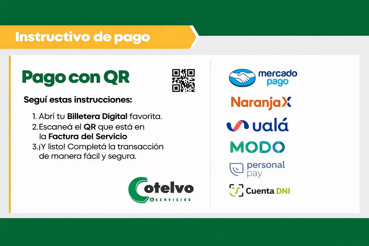 COTELVO Servicios informó que, a partir de la facturación correspondiente al mes de enero, todos los servicios de la cooperativa podrán abonarse mediante billeteras digitales, incorporando así una nueva alternativa de pago ágil, moderna y segura para sus usuarios.