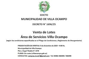 La Municipalidad de Villa Ocampo informa que, mediante el Decreto N° 1696/25, se dispone la venta de lotes correspondientes al Área de Servicios Villa Ocampo, conforme a las condiciones establecidas en el Pliego de Condiciones y Reglamento de Otorgamiento.