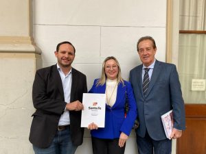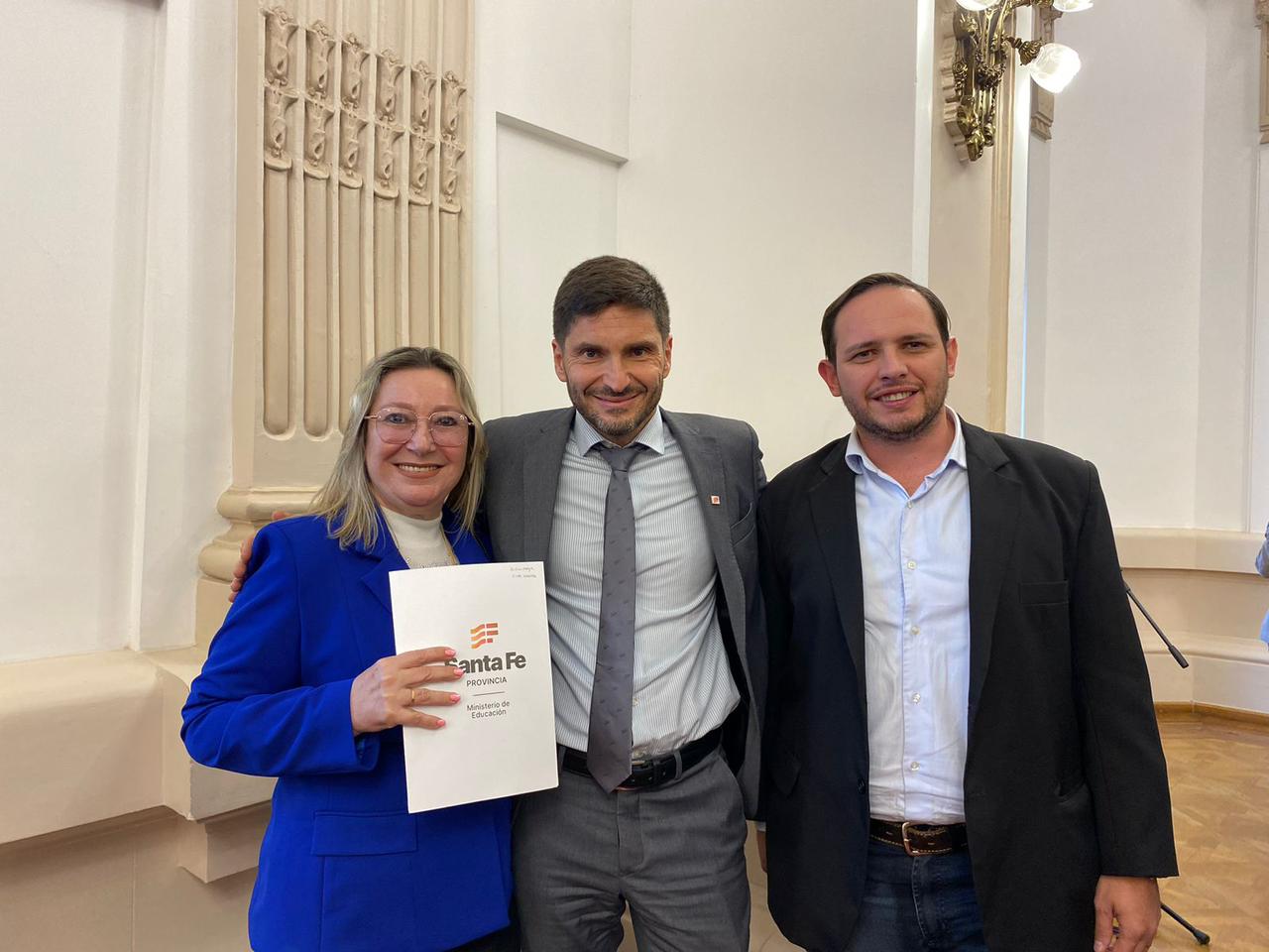 El intendente de nuestra ciudad, Cristian Marega, junto a la directora de la Escuela N° 849 Yapeyu, María del Rosario Caballero, estuvieron hoy en la ciudad de Santa Fe para la firma de convenios del Gobierno de Santa Fe con municipios y comunas en el marco del programa Mil Aulas.