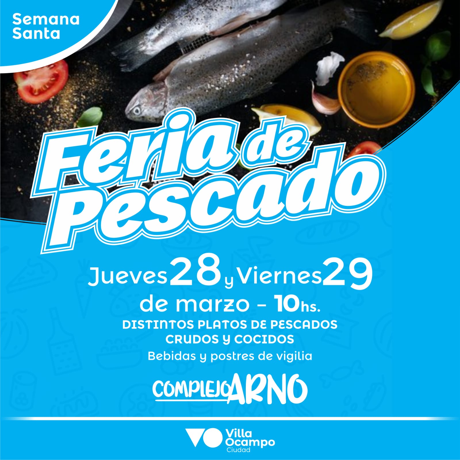 La Municipalidad de Villa Ocampo invita a la comunidad a la Feria de Pescado que se realizará los días jueves 28 y viernes 29 de marzo en el Complejo Cultural, Social y Deportivo ARNO.