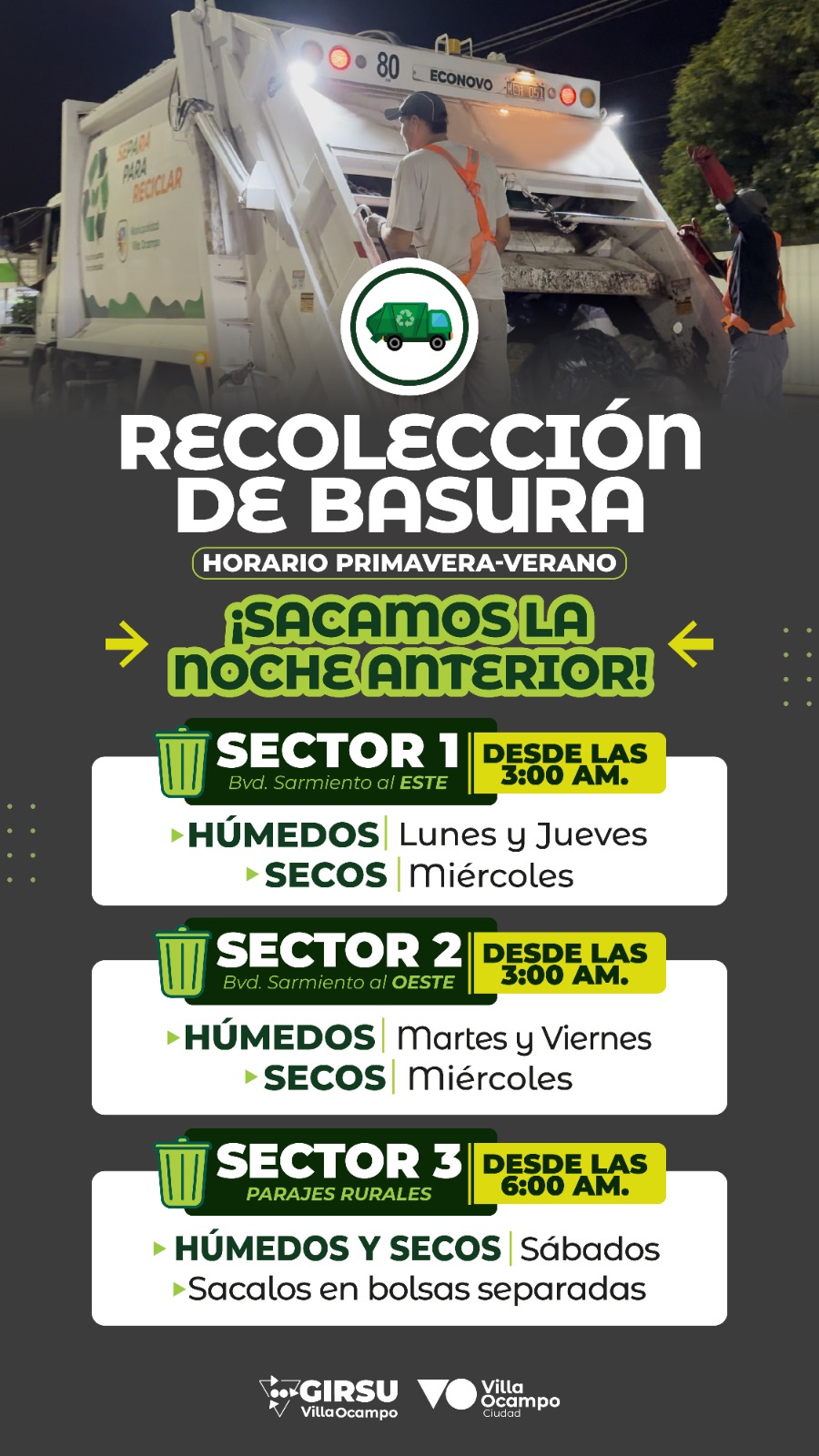 La Municipalidad de Villa Ocampo informa que a partir del lunes 4 de noviembre regirá el horario de recolección de residuos primavera-verano. Se solicita a los vecinos sacar la basura la noche anterior al día programado , en el sector correspondiente y siguiendo la separación de residuos.