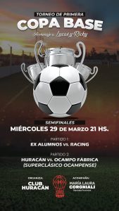 María Laura Corgniali invita a toda la comunidad a participar de las semifinales de la Copa BASE en el estadio Juan David Getar del Club Huracán donde se jugarán los partidos de Primera División: Ex Alumnos vs. Racing El Campesino y el “clásico ocampense” Huracán vs. Ocampo Fábrica.
