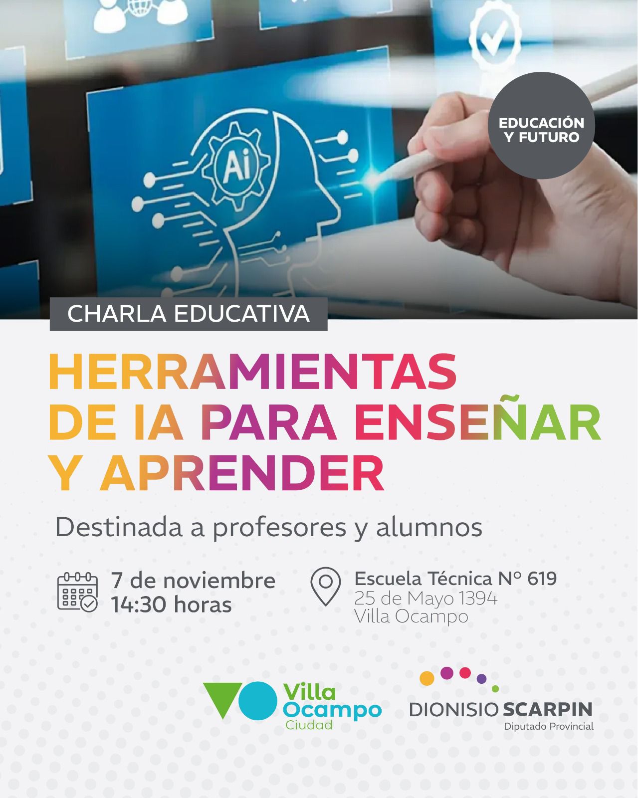 La Municipalidad de Villa Ocampo informa que el próximo viernes 7 de noviembre a las 14:30 horas, se llevará a cabo la charla educativa “Herramientas de IA para enseñar y aprender”, destinada a docentes y estudiantes de nuestra ciudad.