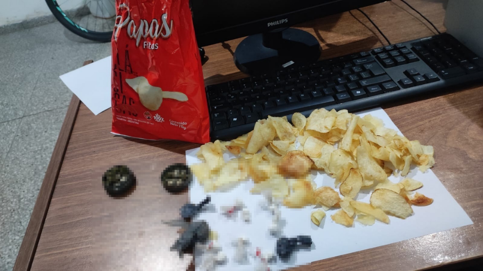 Al realizar la requisa correspondiente, los uniformados encontraron dentro de una bolsa de papas fritas envoltorios de nylon transparente con sustancia blanca, similar a cocaína, y una bolsa de color negro con sustancia vegetal compacta, de olor y aspecto compatible con marihuana.