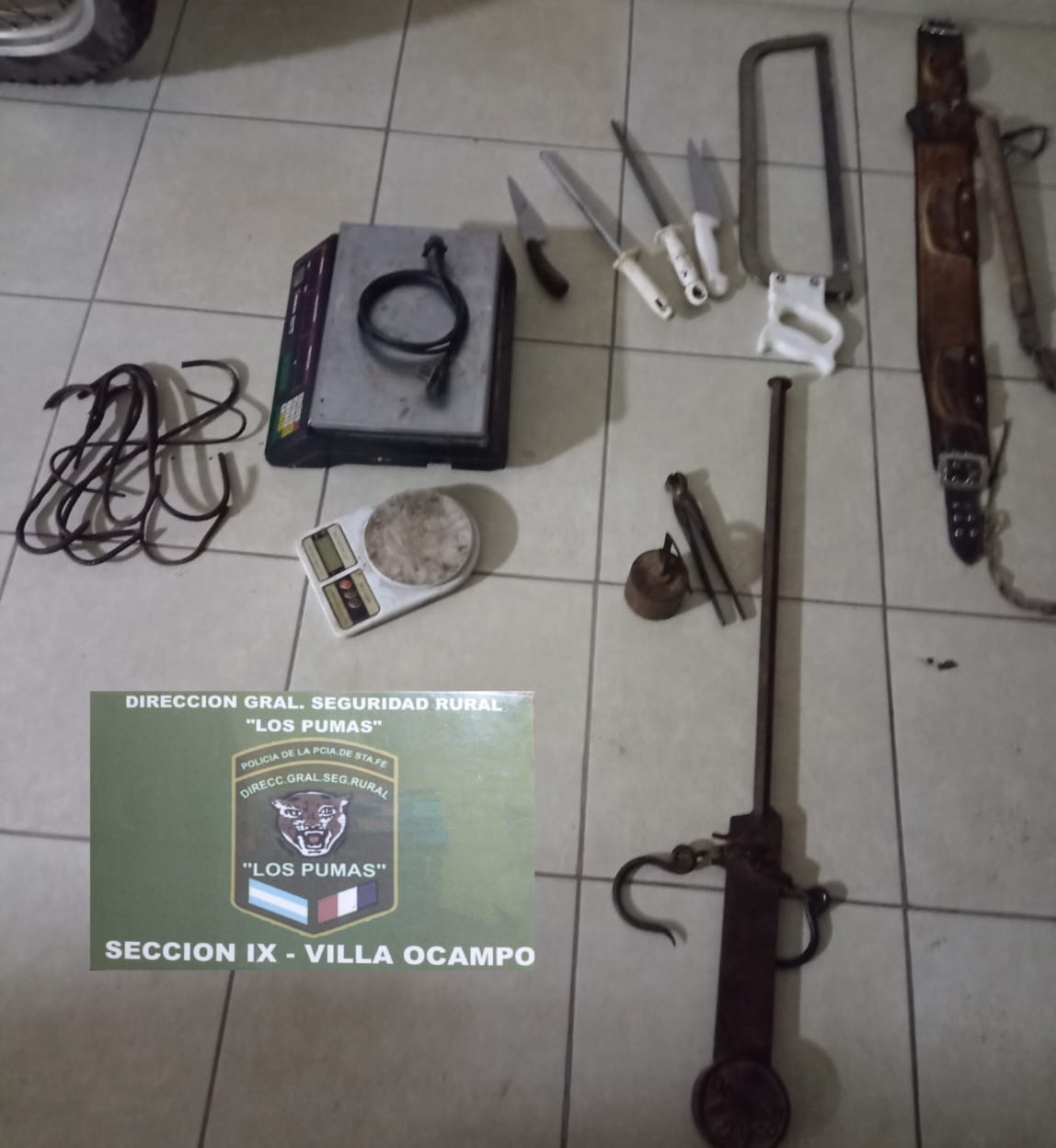 A raíz de las averiguaciones, los efectivos llevaron a cabo una requisa en un domicilio de la localidad de Tacuarendí, donde fueron recibidos por una mujer mayor de edad. El procedimiento arrojó resultados positivos: se incautaron 70 kilogramos de carne, cuchillos, ganchos de metal y una sierra tipo carnicera.