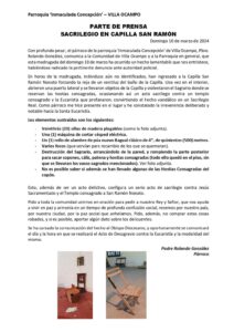 Con profundo pesar, el párroco de la parroquia ‘Inmaculada Concepción’ de Villa Ocampo, Pbro. Rolando González, comunica a la Comunidad de Villa Ocampo y a la Parroquia en general, que esta madrugada del domingo 10 de marzo ha ocurrido un hecho lamentable que nos entristece, habiéndose radicado la pertinente denuncia ante autoridad policial.