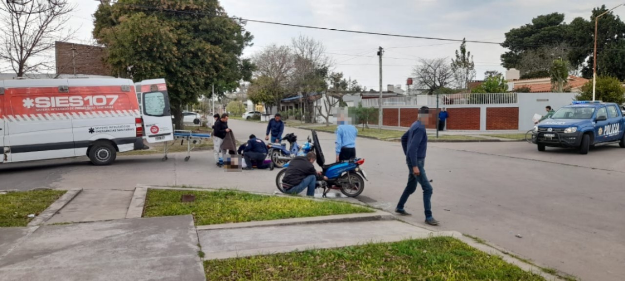Personal de la Comisaria IV UR IX, tomo intervención en accidente de tránsito ocurrido en calle 9 de julio y Güemes de esa, donde por causas que se tratan de establecer entraron en colisión motocicleta marca HONDA, modelo WAVE, color azul, conducida por femenina de 27 años de edad, domiciliada en Barrio Los Amores de esa ciudad y motocicleta marca CORVEN, modelo ENERGY 125, color turquesa, conducida por un hombre de 66 años de edad, domiciliado en ese medio. Como consecuencia ambos participes fueron trasladados al nosocomio local para su atención.