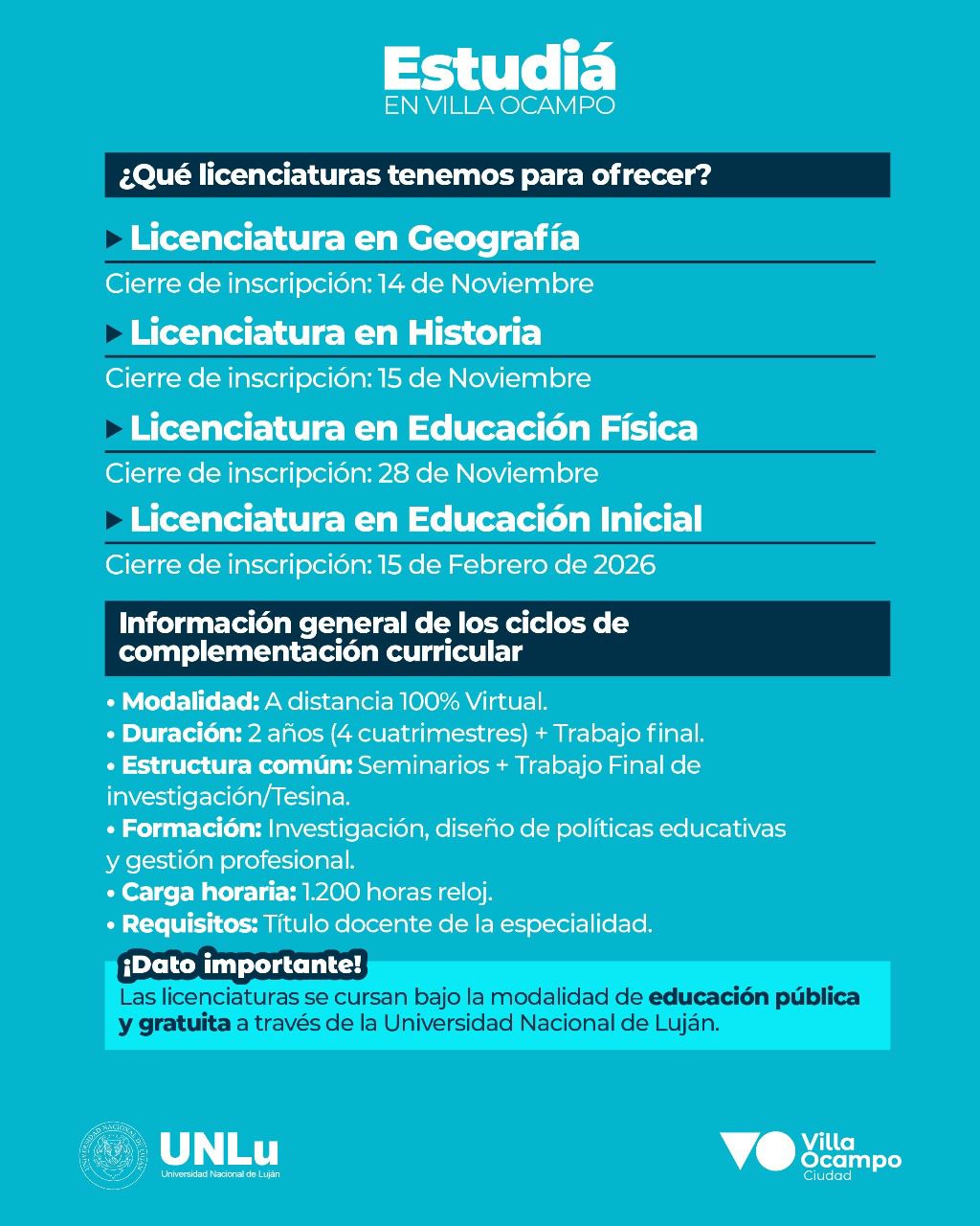 La Municipalidad de Villa Ocampo, a través de la articulación con la Universidad Nacional de Luján (UNLu), informa que se encuentran abiertas las inscripciones para los Ciclos de Complementación Curricular dictados bajo la modalidad 100% a distancia, destinados a quienes ya poseen un título previo de nivel terciario o universitario otorgado por instituciones reconocidas.
