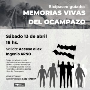 Una iniciativa destinada a promover el conocimiento y la apreciación del patrimonio histórico-cultural de nuestra ciudad y a poner en valor las luchas populares con un recorrido en bicicleta por los hitos del Ocampazo. Inscripciones al número: 3482-673907. Reservar lugar con anticipación, ya que el cupo es limitado y venir con bicicleta. Actividad gratuita.
