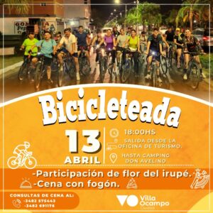 Bicicleteada hasta el Camping Don Avelino, cena con fogón y actuaciones de artistas locales. Número especial de la escuela de danzas folklóricas “Flor del Irupé”. Consultas al número: 3482-691176.