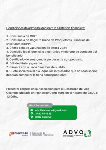 Los interesados deben presentar la documentación en la Asociación para el Desarrollo de Villa Ocampo, ubicada en Francisco Conti 1995, en el horario de 8:00 a 12:00 horas.