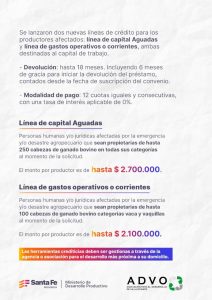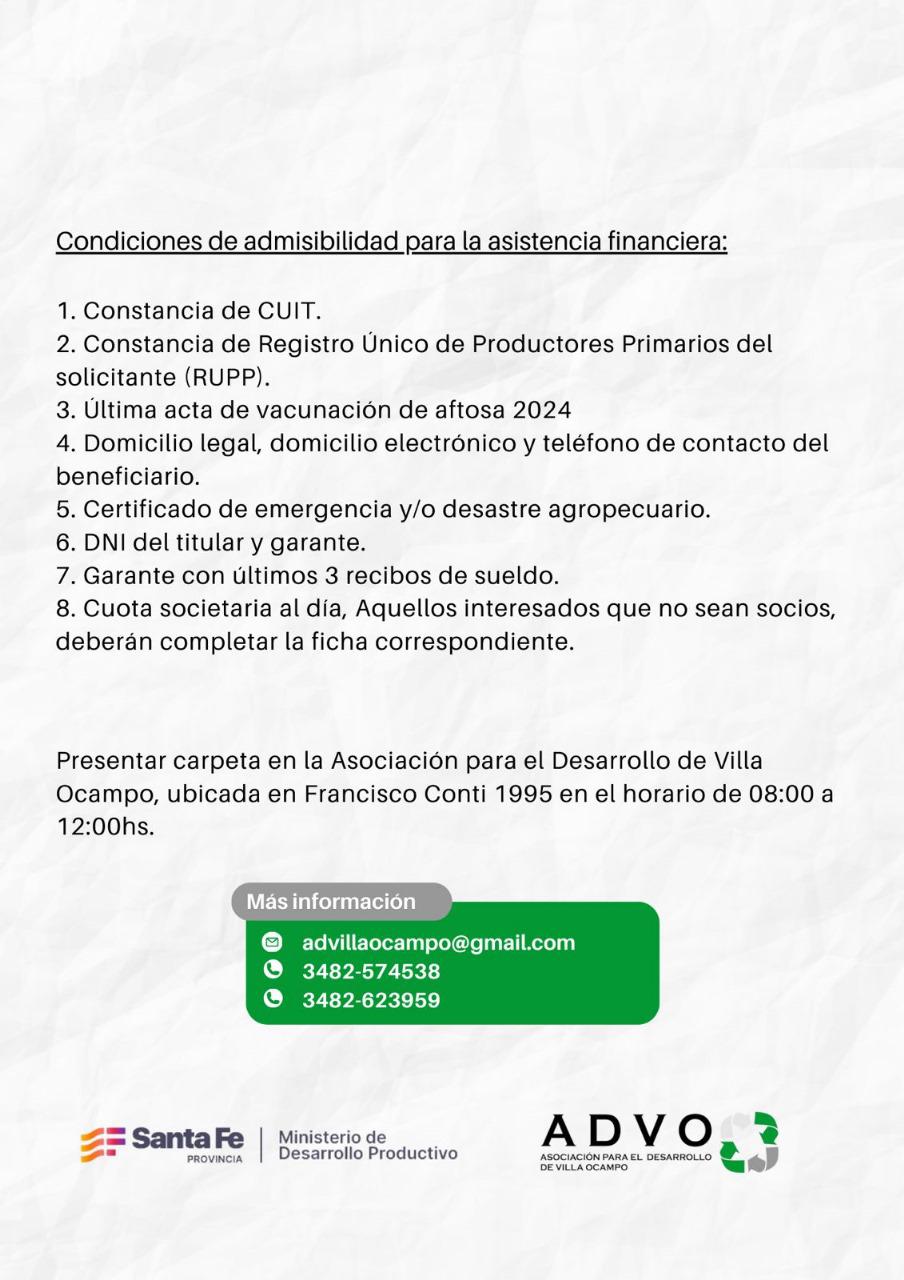 La Asociación para el Desarrollo de Villa Ocampo (ADVO), junto al Ministerio de Desarrollo Productivo de la Provincia de Santa Fe, informa el lanzamiento de dos nuevas líneas de crédito destinadas a los productores afectados por la emergencia y/o desastre agropecuario en la zona.