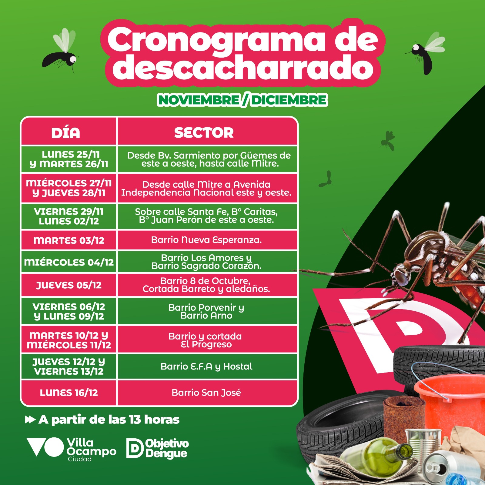 La Municipalidad de Villa Ocampo informa que, en el marco del programa “Objetivo Dengue”, se llevará a cabo un operativo de descacharrado en distintos sectores de la ciudad durante el mes de noviembre y diciembre. El cronograma establece jornadas específicas para cada barrio, comenzando a partir de las 13 horas con la recolección, y por la mañana con la concientización casa por casa; con el objetivo de reducir posibles criaderos del mosquito Aedes aegypti, transmisor del dengue, zika y chikungunya.