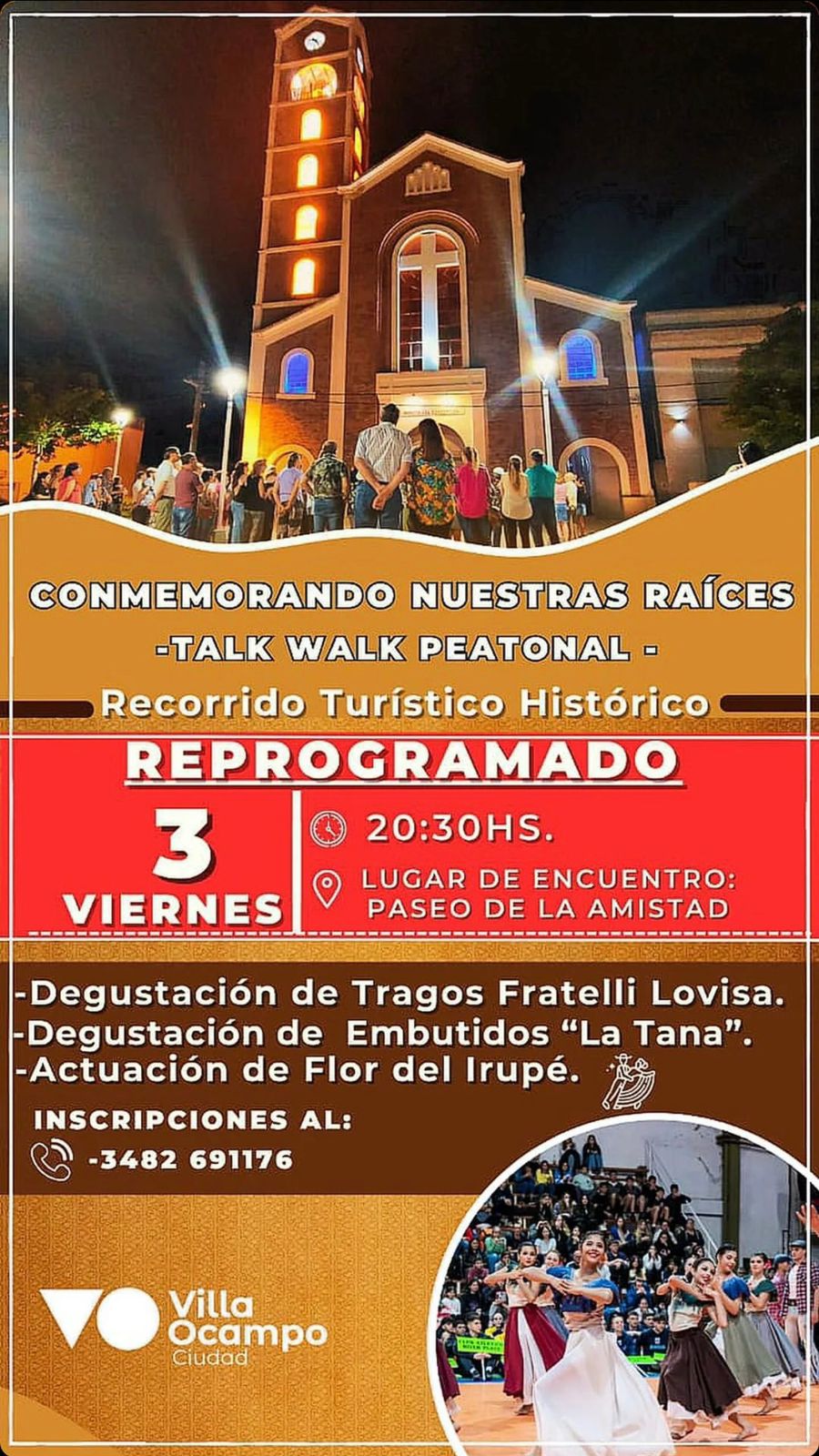 El lugar de encuentro será en el Paseo de la Amistad de Plaza Belgrano. En la actividad, se remontará a nuestras raíces desde la fundación de Villa Ocampo y se destacarán los edificios representativos alrededor de la plaza. Además, actuará la escuela municipal de danzas folclóricas, Flor del Irupé, como cierre del circuito junto a degustaciones de tragos Fratelli Lovisa.