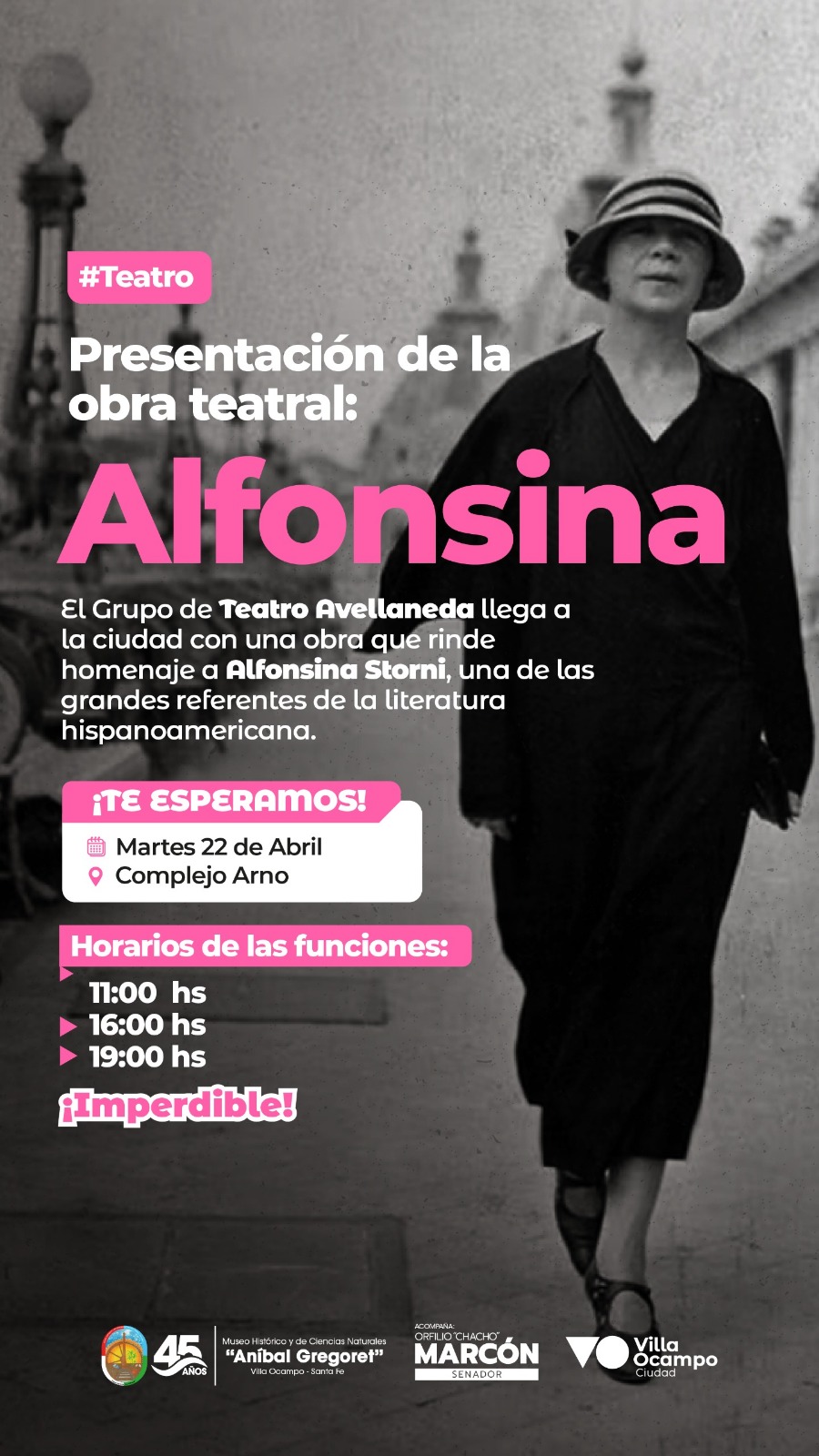 Mañana martes 22 de abril se presentará en nuestra ciudad la obra “Alfonsina”, a cargo del reconocido Grupo de “Teatro Avellaneda”; una propuesta escénica que rinde tributo a la destacada escritora y poetisa Alfonsina Storni, una de las figuras más relevantes de la literatura hispanoamericana.