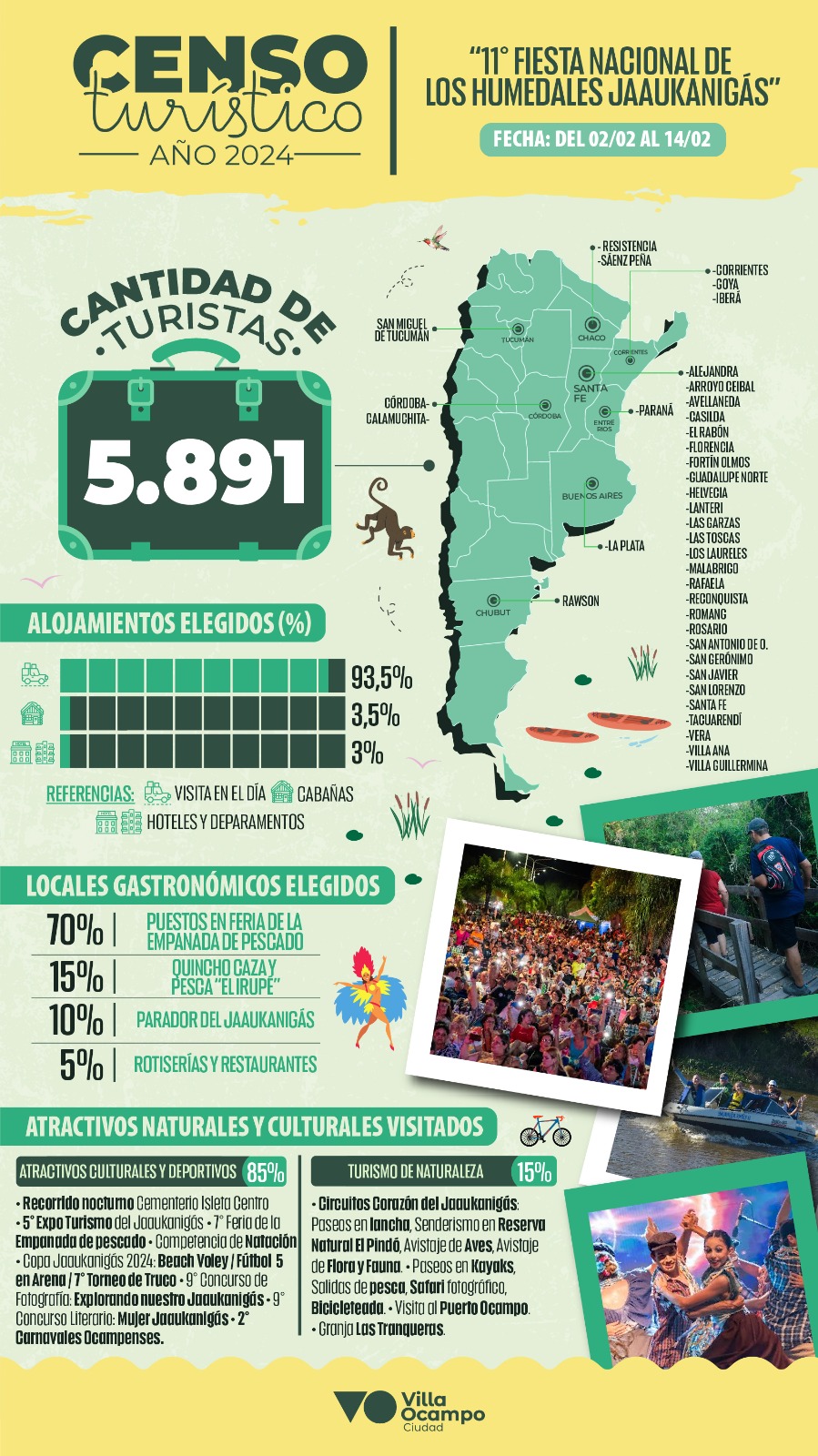 El Área de Turismo, junto a la Cámara de Turismo de Villa Ocampo, realizaron un nuevo relevamiento en la localidad en el marco de la *11° Fiesta Nacional de los Humedales “Jaaukanigás”*, dando a conocer la convocatoria que tuvieron los diferentes eventos organizados por el municipio, circuitos ecoturísticos en el Corazón del Jaaukanigás y actividades particulares de los prestadores privados, desde el 2 al 14 de febrero inclusive.