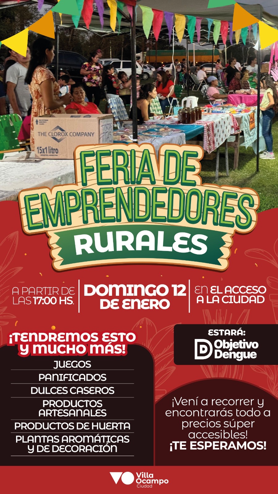 La Secretaría de Promoción Social de la Municipalidad de Villa Ocampo invita a una nueva edición de la Feria de Emprendedores Rurales, que se llevará a cabo este *domingo 12 de enero* en el acceso principal de la ciudad, Av. San Martín y Ruta Nacional N°11.