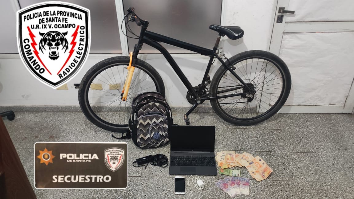 EL Damnificado reconoció la notebook que le fue sustraída publicada a la venta por redes sociales, pactando la compra y encuentro con el vendedor; dio conocimiento de tales circunstancias al personal policial. Así las cosas, personal policial se aboco al hecho logrando dar con un masculino en Ruta 32 y Bv Sarmiento, éste circulaba en bicicleta tipo montanbike, color negra, llevando una mochila, de la requisa de sus pertenencias procedieron al secuestro de; una computadora portátil ( Notebook) marca HP color gris oscuro, un Cargador de computadora color negro marca ONLY, un teléfono celular marca IPHONE carcaza color rose gold, un cargador de celular color blanco, dinero en efectivo, también de la mochila y bicicleta en la que circulaba, como así también procedieron a la APREHENSION de quien resulto ser joven de 20 años de edad, domiciliado en calle Mitre y Santa Fe.