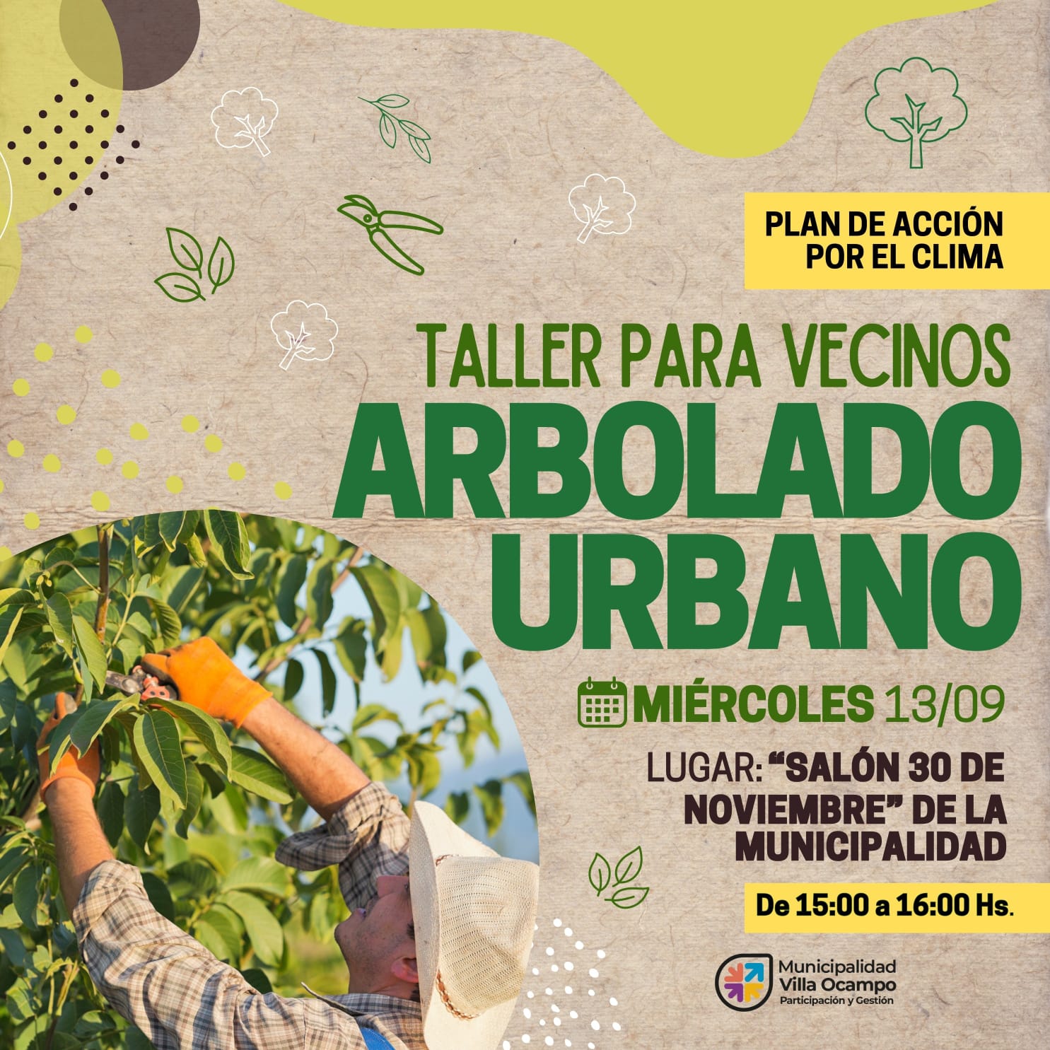 La Secretaría de Sistemas Productivos y Medio Ambiente de la Municipalidad de Villa Ocampo invita a un Taller de Arbolado Urbano, abierto a todos los interesados, que se va a llevar a cabo este miércoles 13 de septiembre, de 15:00 a 16:00 Hs. en el Salón “30 de Noviembre” del Palacio Municipal.