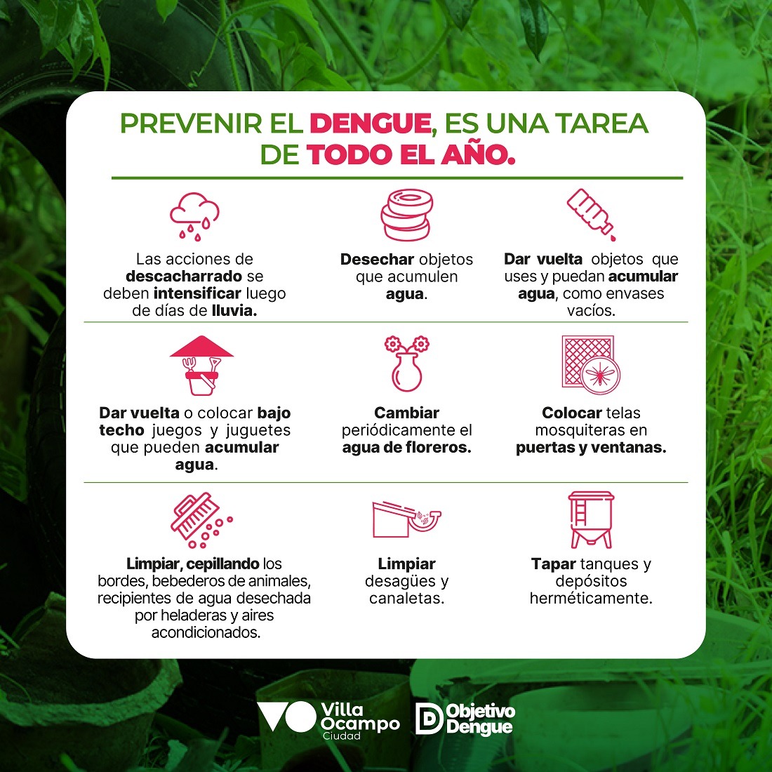 La prevención del dengue comienza en casa y es una tarea de todo el año. Desde la Municipalidad de Villa Ocampo, se sigue trabajando en la concientización y cuidados para evitar la propagación del dengue.